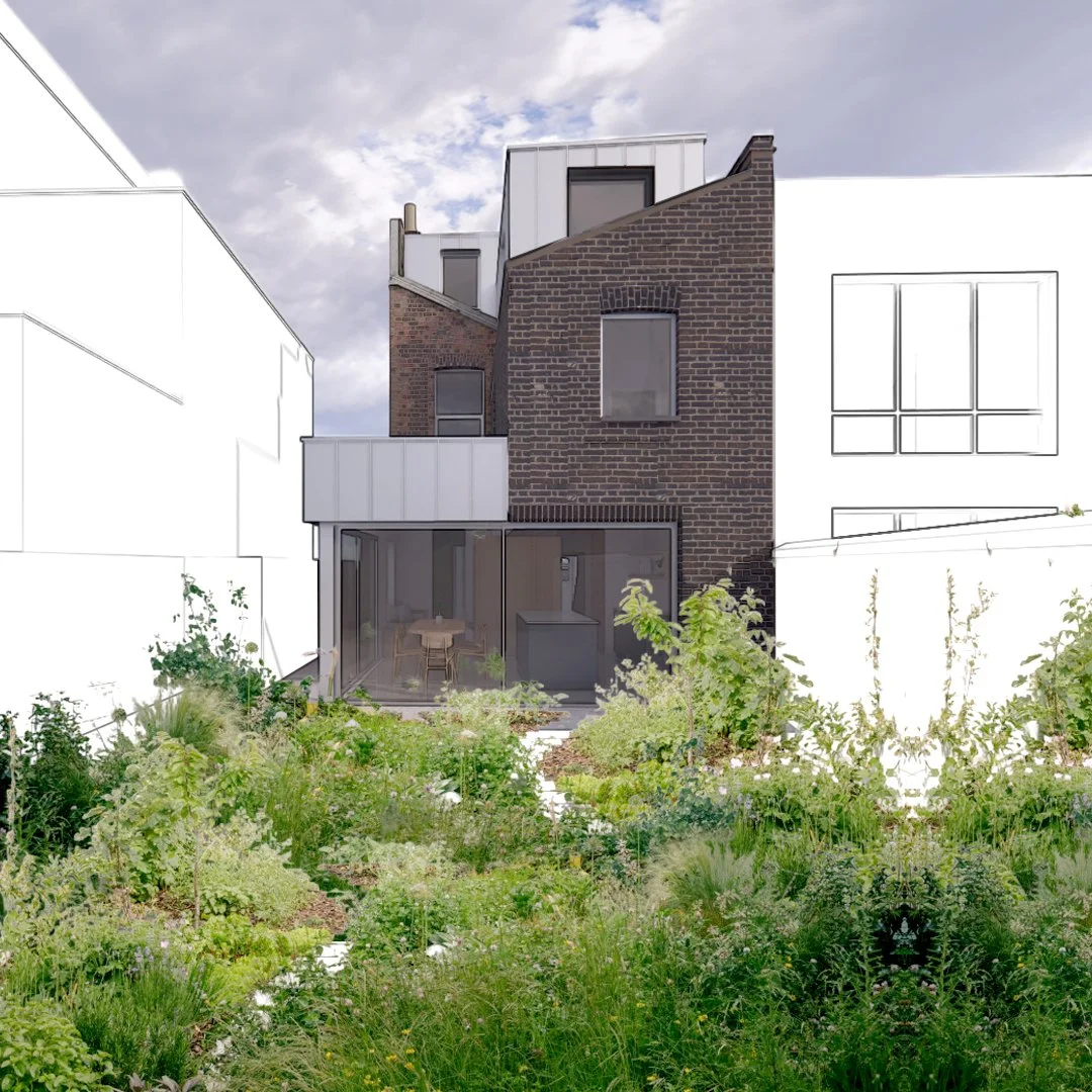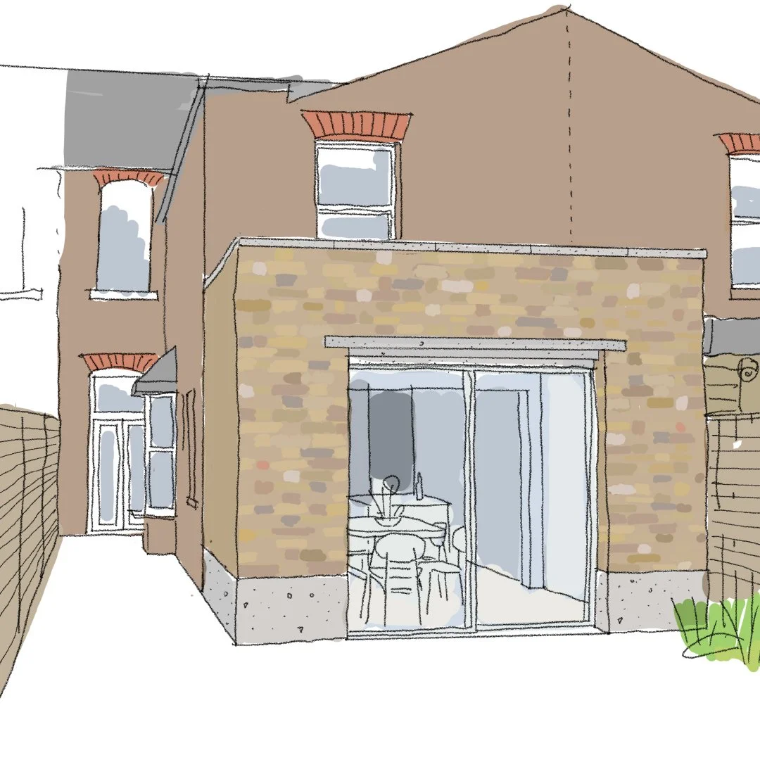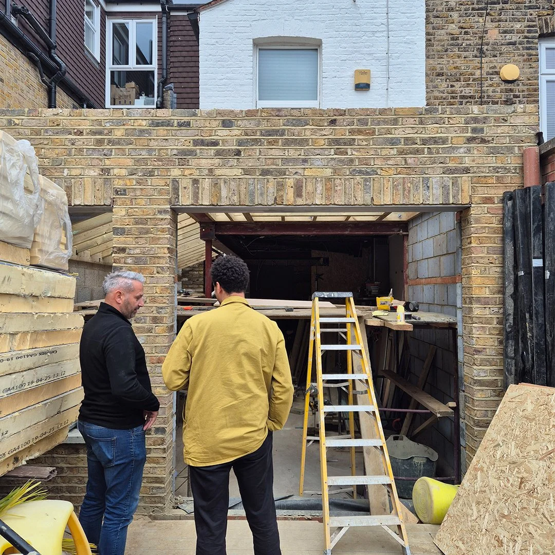 A ground floor wraparound kitchen extension in Haringey, currently underway. Reclaimed brick pairs with light aluminium doors and windows, with options for concrete plinths and stepped lintels. Exposed rafters add rhythm and volume, creating a spacious, textured interior that balances warmth with material clarity.