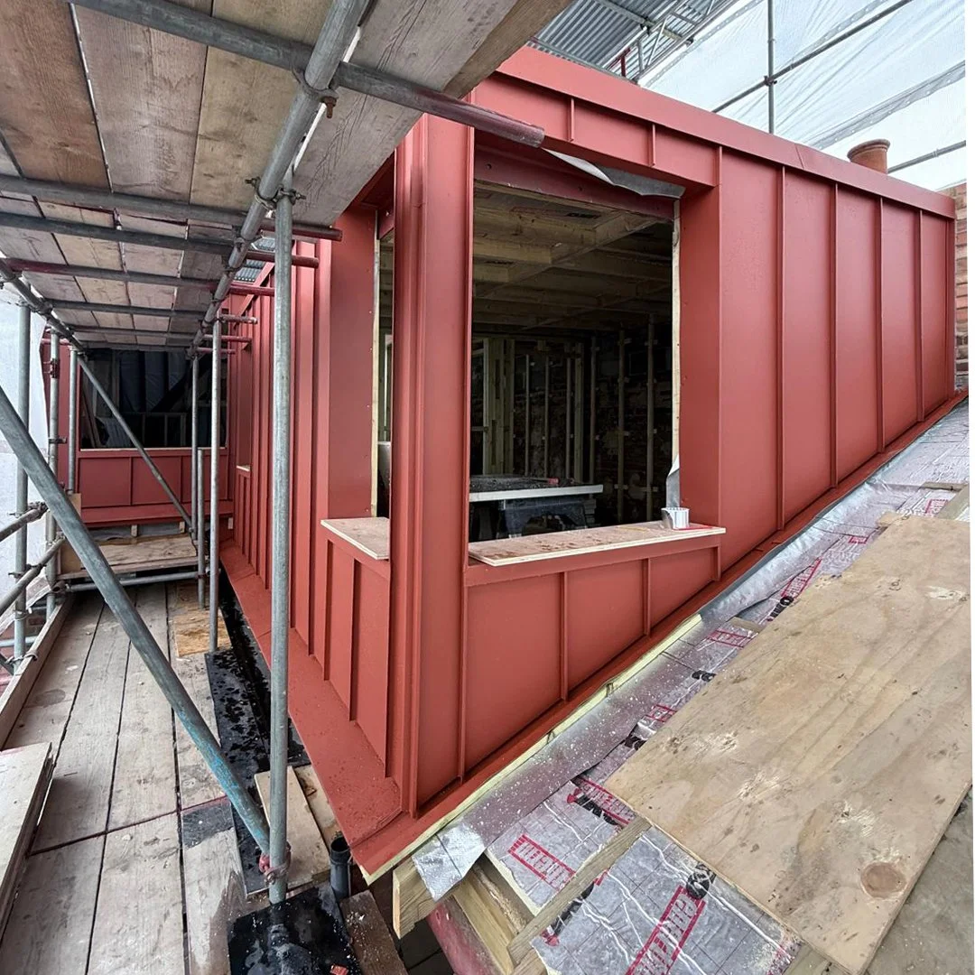 A refined red metal-clad addition delivers a guest bedroom, study, and bathroom with striking corner views. Alongside first-floor upgrades—including an ultra-efficient utility and family bathroom—it marks a growing family's next step toward a forever home and deeper roots in their neighbourhood