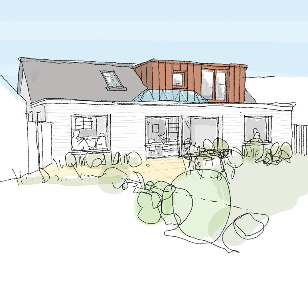 A house extension at the south of the city centre, creating a generous family home out of a thin semi detached pebble dashed 1930s house.