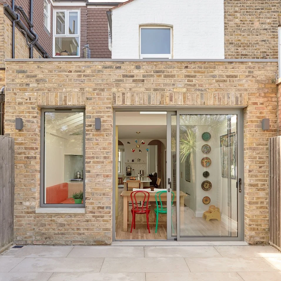 A modest rear extension to a ground floor flat in Haringey, extending just a few metres to unlock a better kitchen layout, improved daylight, and stronger garden connection. Handmade bricks and stepped precast concrete lintels frame elegant sliding doors, adding texture and quiet character.