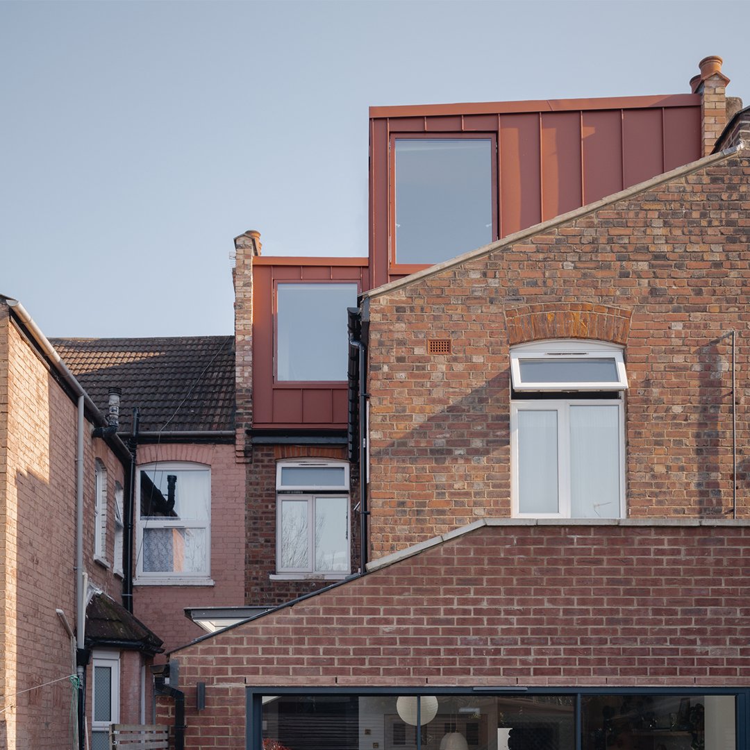 Kitchen extension with L-shaped mansard roof in Hackney. Sooty brick, elegant silvery standing seam cladding, and clean glazed openings quietly reorganise and open up the kitchen and living areas. A super-efficient, sensuous rooftop master suite completes the calm transformation.