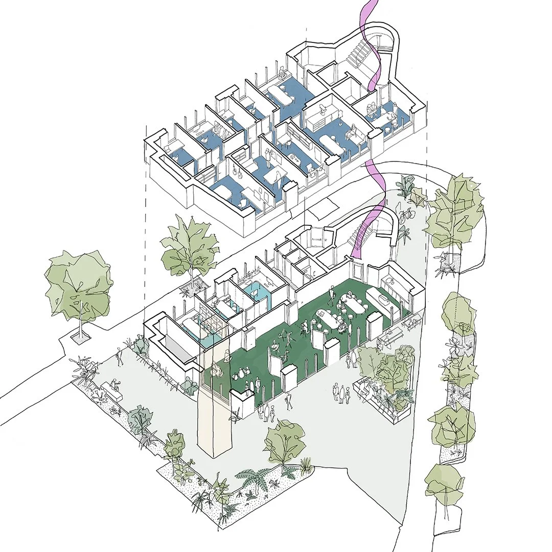 An enclosed, vibrant complex of artists studios, workshops, gardens, yoga studios, local business, self build studios and men’s mental health sheds. Coordinated the re use and extension of the former daycare centre - creating new routes and the insertion of new external structures.